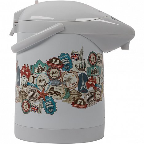 К корпусу термопота крепится эргономичная ручка для удобной переноски. На корпус нанесена шкала с индикатором, позволяющим контролировать уровень воды.